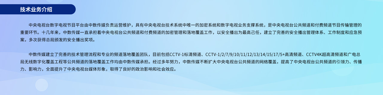 2018年10月開始,中數傳媒負責中國首個上星超高清電視頻道—中央廣播電視總臺4K超高清頻道的傳輸和落地宣傳工作,基本實現了中央廣播電視總臺4K超高清頻道的全國覆蓋。